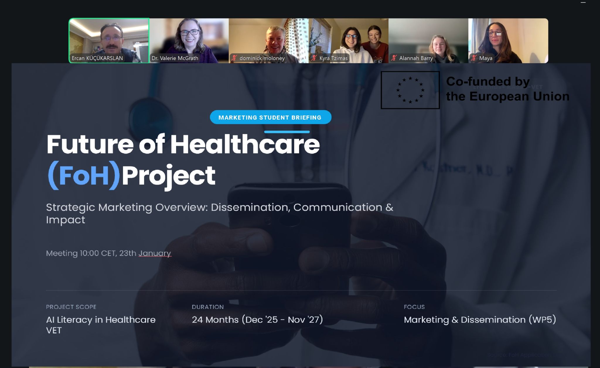As part of the Future of Healthcare (FoH) Erasmus+ project, we were delighted to collaborate with Marketing students from Munster Technological University (MTU) during an interactive online session dedicated to project communication and dissemination. This session created an excellent opportunity to connect academic learning with real European project implementation, allowing students to engage directly with a live Erasmus+ initiative addressing the future of digital health and vocational education.